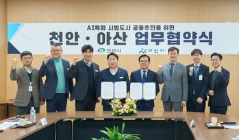 충남 천안시와 아산시가 국토교통부가 추진하는 ‘K-AI 특화시범도시’ 조성사업 유치를 위해 공동 대응에 나섰다.천안시는 지난 5일 천안아산상생협력센터에서 김석필 천안시장 권한대행 부시장과 오세현 아산시장이 참석한 가운데 ‘AI 특화 시범도시 공동 추진 업무협약’을 체결