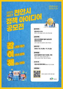 천안시는 시민이 직접 참여해 참신한 아이디어로 시정에 변화를 이끌 수 있도록 ‘2025 하반기 천안시 정책 아이디어 공모전’을 개최한다고 21일 밝혔다.이번 공모전은 ‘참.여.해.(참신한 제안, 여럿이 함께, 해내는 변화)’를 슬로건으로 내걸고, 시민들의 창의적인 제안