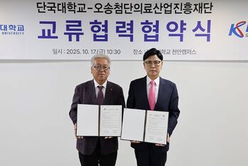단국대학교(총장 안순철)는 17일 오송첨단의료산업진흥재단(KBIOHealth, 이사장 이명수)과 의료산업 분야 인재양성 및 산학협력을 위한 업무협약을 체결했다.이날 협약식에는 단국대 백동헌 천안부총장, 민동원 취창업지원처장, 이충현 산학협력단 부단장과 오송첨단의료산업진