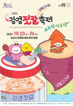 충남 논산시와 논산문화관광재단은 '2025 강경젓갈축제' 포스터를 1일 공개했다. 축제는 오는 23일부터 26일까지 나흘간 강경 금강둔치 일원에서 열린다.올해 주제는 ‘강경젓갈과 상월고구마, 어우렁더우렁’으로, 전통 음식문화와 지역 농특산물을 중심으로 다양한