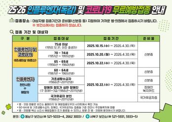 천안시는 오는 22일부터 2025-2026절기 인플루엔자(독감) 무료 예방접종을 시작한다고 5일 밝혔다.올해부터는 세계보건기구(WHO) 권고와 예방접종전문위원회 심의에 따라 기존 4가 백신에서 3가 백신으로 변경해 접종이 시행된다. 3가 백신은 4가 백신 중