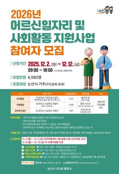 충남 논산시(시장 백성현)는 2026년도 어르신일자리와 사회활동 지원사업 참여자를 12월 2일부터 12일까지 모집한다고 27일 밝혔다.올해보다 304명 증가한 총 4582명을 선발하며 △공익형 3127명 △역량활용형 1095명 △공동체사업단 360명 등이다.신청 자격은
