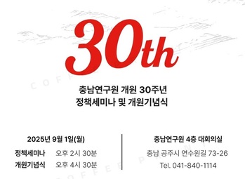 올해 개원 30주년을 맞은 충남연구원이 내달 1일 비전 선포식과 정책세미나를 개최한다.23일 충남연구원에 따르면, 1995년 설립 이후 충남도와 15개 시·군의 균형발전과 도민 행복 실현을 위한 정책 연구에 매진해온 충남연구원은 이번 행사에서 지난 30년의 성과를 돌아
