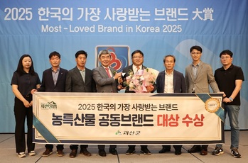 충북 괴산군의 농특산물 공동브랜드 ‘청정괴산 자연울림’이 대한민국 대표 농특산물 브랜드로 자리매김했다.군은 22일 서울가든호텔서 열린 ‘2025 한국의 가장 사랑받는 브랜드 대상’ 시상식에서 농특산물 공동브랜드 부문 대상을 수상했다고 밝혔다.‘한국의 가장 사랑받는 브랜