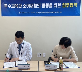 충북도교육청 직속기관 특수교육원(원장 최명옥)은 21일 충북권공공어린이재활의료센터(센터장 권인수)와 재활의료센터에서 장애학생 학습권 보장을 위한 업무협약을 체결했다.이번 업무협약은 기존의 협약을 공고히 해 체계적이고 지속 가능한 병원학교 운영 기반을 마련해 집중 재활