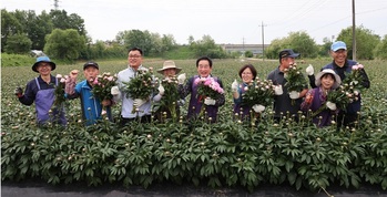 충북 진천군이 절화 작약 수확을 시작했다고 밝혔다. 19일 이월면 신월리 일원에서 진행된 수확 활동에는 월촌개발위원회(위원장 정승준)를 비롯한 동네 주민들이 참여했다.이날 송기섭 진천군수도 현장을 찾아 수확을 함께하며 “마을이 함께 키운 이 꽃들이 진천 농업의 미래를