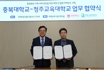 충북대학교(총장 고창섭)와 청주교육대가 7일 대학본부서 ‘충북도 지역사회 공헌을 위한 협력 거버넌스 구축’을 위한 업무협약을 체결했다고 밝혔다.이번 협약식은 고창섭 충북대 총장, 한대희 청주교대 총장을 비롯해 양 기관 보직자 및 직원들이 참석한 가운데 진행됐으며, 이번