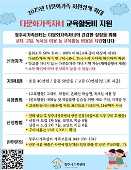 충북 청주시가족센터(센터장 박미영)는 오는 30일까지 ‘2025년 다문화가족 자녀 교육활동비 지원사업’ 신청접수를 진행한다고 2일 밝혔다. 이번 사업은 다문화가족의 경제적 부담을 완화하면서 학습 격차 해소 및 교육 기회 확대를 목적으로 추진된다.지원대상은 교육