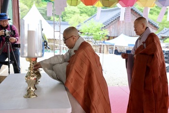 불기 2569년 부처님오신날인 5일 대한불교 조계종 제5교구본사 법주사 대웅보전 앞에서 봉축 법요식을 봉행했다.이날 행사는 ‘세상에 평안을, 마음에 자비를’이라는 표어 아래 육법 공양을 시작으로 삼귀의례, 반야심경 낭송, 헌화, 봉축사, 축사, 발원문 낭독, 관불 의식