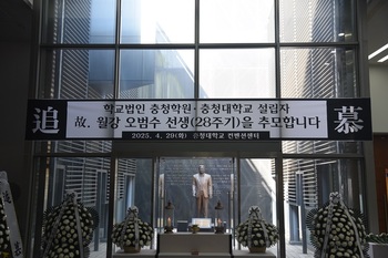 학교법인 충청학원(이사장 오경나)과 충청대학교(총장 송승호)는 29일 오전 충청대학교 컨벤션센터 월강기념관 동상 앞에서 설립자 고(故) 월강(月岡) 오범수 선생의 제28주기 추도식을 엄숙히 거행했다.이날 추도식에는 오경나 이사장, 송승호 총장을 비롯해 교무위원, 보직자