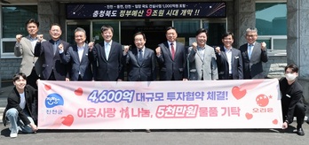 충북 진천군은 ㈜오리온이 진천군 지역사회보장협의체와 함께 ‘이웃사랑 정 나눔 기탁식’을 갖고 어린이날을 맞이 5000만원 상당의 물품을 기탁하며 지역 선행에 나섰다고 29일 밝혔다.㈜오리온은 지난 16일 진천군과 4600억원의 대규모 투자협약(MOU)을 체결했다.기탁식