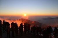 병신년(丙申年) 새해 첫 일출이다.민족의 명산으로 불리는 소백산 연화봉과 백두대간 산등성 사이로 7시 34분 장험한 새해 첫 일출의 모습이 나타나자 해맞이 등반객들은 일제히 환호를 질렀다.이날 소백산 연화봉에는 새해일출을 보려는 해맞이 등반객 1200여명이 웅집해 새해