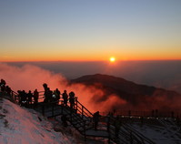 병신년(丙申年) 새해 첫 일출이다.민족의 명산으로 불리는 소백산 연화봉과 백두대간 산등성이 사이로 7시 34분 장험한 새해 첫 일출의 모습이 나타나자 해맞이 등반객들은 일제히 환호를 질렀다.이날 소백산 연화봉에는 새해일출을 보려는 해맞이 등반객 1200여명이 웅집해 새