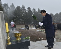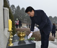 이근규 충북 제천시장이 새해 아침 충혼탑을 찾아 헌화, 참배하고 있다. …