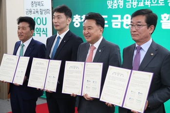 충북도는 28일 도 소회의실에서 금융감독원, 충북도교육청, 하나금융그룹과 함께 충북도 청년·청소년 금융교육 강화를 위한 업무협약을 체결했다고 밝혔다.협약식에는 4개 기관의 대표인 김영환 충북도지사, 이복현 금융감독원장, 윤건영 충북도교육감, 함영주 하나금융그룹회장이 참
