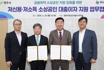 충북 청주시는 28일 어려운 경제상황 속 영세 소상공인의 금융 부담을 덜기 위해 미소금융 충북청주법인(대표 안중춘)과 ‘저신용·저소득 소상공인 대출이자 지원사업’ 협약을 체결했다고 밝혔다.이날 임시청사 직지실에서 개최된 협약식에는 이범석 청주시장과 안중춘 미소금융 충북