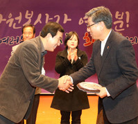 조길형 충주시장(왼쪽)이 12일 충주문화회관에서 열린 '충주시자원봉사자대회'에서 우수봉사자에게 표창을 전달하고 있다. …
