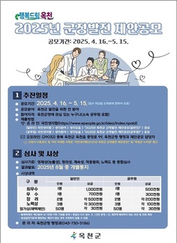 충북 옥천군은 창의적인 정책 제안 발굴과 열린 행정으로 소통하기 위해 16일부터 내달 15일까지 ‘2025년 군정발전 제안 공모’를 실시한다고 밝혔다.옥천 군정에 관심이 있는 국민이라면 지역, 나이 상관없이 누구나 국민생각함(https://www.epeople.go.k