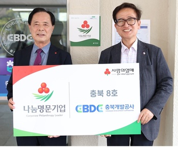 충북개발공사는 9일 충북사회복지공동모금회(회장 이민성) 본사 앞에서 나눔명문기업 8호 현판식을 했다고 밝혔다.이날 현판식은 진상화 충북개발공사 사장, 남지은 노조위원장, 박연상 대외협력실장과 임직원, 충북모금회 이민성 회장이 참석한 가운데 나눔문화 확산을 위