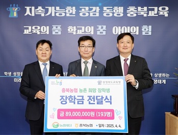 충북도교육청(교육감 윤건영)은 충북농협(본부장 이용선)과 4일 농촌 장학생을 위한 희망 장학금 전달식을 개최하고 미래 인재 양성을 위한 지속적인 지원을 약속했다고 밝혔다.장학금 전달식은 경제적 어려움 속에서도 학업을 이어가는 농촌지역 학생들을 격려하고 학업에 더욱 전념