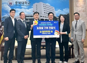 NH농협은행 충북본부(본부장 임세빈)는 대학생 저녁밥 지원을 위해 1일 충북대학교(총장 고창섭)를 찾아 1000만 원 상당의 농협쌀을 전달했다고 밝혔다.전달식에는 고창섭 충북대학교 총장, 임세빈 농협은행 충북본부장, 김종석 농협은행 충북대지점장 등 관계자들이 참석해 지