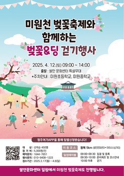 충북 청주시는 상당구 미원면 옥화구곡 관광길을 알리고자 오는 12일에 ‘벚꽃&딩’(벚꽃앤딩) 걷기 행사를 개최한다고 1일 밝혔다.이번 행사는 같은 날 미원면 쌀안문화센터에서 열리는 ‘미원천 벚꽃축제’와 어우러져 더욱 풍성한 행사가 될 예정이다.참가자들은 쌀안문화