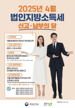 충북 청주시는 4월 법인지방소득세 신고·납부의 달을 맞아, 시내에 사업장을 두고 있는 법인들은 오는 30일까지 법인지방소득세를 신고·납부해야 한다고 1일 밝혔다. 대상은 2024년 12월 말 결산법인으로 영리법인, 수익사업을 영위하는 비영리법인 등 내국법인과
