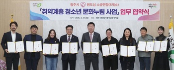 충북 청주시는 31일 취약계층 청소년의 문화 향유 기회를 확대하고 원도심 문화예술의 거리를 활성화하기 위해 원도심 소공연장 8개소와 ‘청소년 문화누림 사업’ 업무협약을 체결했다고 밝혔다.이날 오전 임시청사 직지실에서 개최된 협약식에는 이범석 청주시장, 안종원 소명아트홀