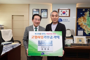 충북 진천군은 31일 청호배관상사 김명호 대표가 진천군청을 방문해 고향사랑기부금 300만원을 전달했다고 밝혔다.김명호 대표는 “재작년에 이어 올해에도 진천군 발전에 힘을 더할 수 있음에 감사한 마음”이라며 “오늘 전달한 기부금 또한 더 나은 생거진천으로 발전할 수 있도