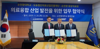 충북 오송첨단의료산업진흥재단(이사장 이명수, 이하 ‘KBIOHealth’)은 의료융합 산업 발전과 협약기관과의 지속가능한 협력을 위해 순천향대학교-순천향중앙의료원과 3자 업무협약을 25일 체결했다고 밝혔다.이번 협약으로 충청권 대학-병원-재단의 협력 체계를 구축해 우리