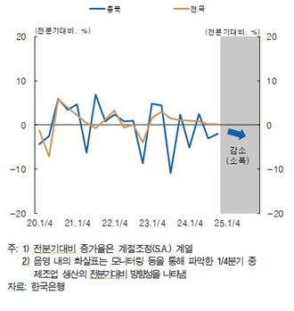 2025년 1분기 충북 지역 경기가 전 분기보다 소폭 감소한 것으로 나타났다. 제조업과 서비스업 생산이 동반 하락한 가운데, 민간소비와 투자, 수출도 줄어든 영향이다. 24일 한국은행 충북본부가 2월 중순부터 3월 초까지 지역 내 업체 및 유관기관을 대상으로