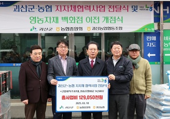 충북 괴산군(군수 송인헌)은 지난 18일 오후 괴산농협 경제종합지원센터에서 괴산농협 영농자재백화점 개점식에 맞춰 ‘괴산군괴산농협 지자체 협력사업 농기계 전달식’을 가졌다고 19일 밝혔다.이날 행사에는 송인헌 괴산군수를 비롯해 김두영 농협중앙회괴산군지부장, 김응식 괴산