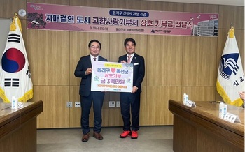 충북 옥천군(군수 황규철)은 19일 부산광역시 동래구(구청장 장준용)와 고향사랑기부제 활성화 등 자매도시 협력 강화를 논의했다고 밝혔다.이날 부산 동래구 신청사 개청 행사에서 열린 기부금 전달식을 통해 옥천군은 동래구에, 동래구는 옥천군에 각각 고향사랑기부금 300만