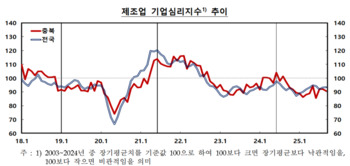 충북 지역 기업들의 경기 체감이 다시 얼어붙고 있다. 제조업과 비제조업 모두 기업심리지수(CBSI)가 하락하며 향후 경기에 대한 전망까지 급격히 악화됐다.한국은행 충북본부가 26일 발표한 ‘2025년 9월 충북지역 기업경기조사’에 따르면, 9월 제조업 CBSI는 90.