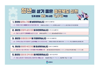 충북도는 27일 올해 사업비 4041억 원을 투입해 일자리·주거·교육·복지·참여 등 5개 분야에 대해 99개의 청년정책을 추진할 계획이라고 밝혔다.우선, 청년들의 일하는 기쁨과 일할 권리를 보장하기 위해 9만 개의 청년일자리 창출을 지원한다. 청년에게 적합한 지역일자리