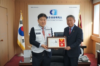 대한적십자사 충북지사(회장 장현봉·이하 충북적십자사)는 24일 청주상공회의소에서 ㈜선우켐텍 차태환 대표에게 회원유공장 명예대장 및 공로패를 수여했다.차태환 대표는 ㈜선우켐텍의 대표로서 충북적십자사에 누적 1억 원 이상의 회비 등을 기부하여 회원유공장 명예대장을 수상했다