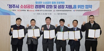 충북 청주시는 24일 청주시 소상공인 경쟁력 강화와 성장 지원을 위해 HCN충북방송, KT텔레캅 충남충북본부와 업무협약을 체결했다고 밝혔다.이날 오후 임시청사 직지실에서 개최된 협약식에는 이범석 청주시장, 최욱 HCN충북방송 총괄본부장, 이희 KT텔레캅 충남충북본부 본