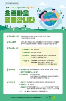 충북 청주국제에코콤플렉스와 초록마을사업추진위원회는 21일 2025년 탄소중립 초록마을사업에 참여할 ‘초록마을’을 모집한다고 밝혔다.초록마을사업은 청주시가 2010년부터 추진하고 있는 민‧관 협력 기후변화대응 시민실천사업이다.초록마을은 사업에 참여해 지구온난화의 주범인