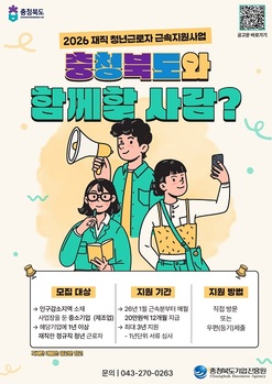 충북기업진흥원이 인구감소지역 청년들의 안정적인 지역 정착을 유도하고 중소기업의 인력난 해소를 위해 ‘2026년 재직 청년근로자 근속지원사업’ 신규 참여자를 선발한다.지원 대상은 제천, 보은, 옥천, 영동, 괴산, 단양군 소재 제조업 중소기업에 재직 중인 19세 이상 3