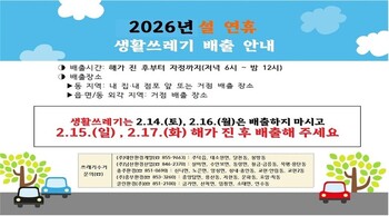 충주시가 2026년 설 연휴 동안 쾌적한 도심 환경 유지 및 시민과 귀성객의 생활 쓰레기 배출 불편을 최소화하기 위해 설 연휴 쓰레기 관리 종합대책을 추진한다고 10일 밝혔다.연휴 전, 불법투기 단속반을 운영해 다중이용시설 및 상습 불법투기 지역을 중심으로 단속을 강화