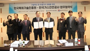 한국가스안전공사(사장 박경국, 이하 ‘공사’)와 한국특허기술진흥원(원장 김명섭, 이하 ‘KIPRO’)이 12일 한국특허기술진흥원 서울사무소에서 가스안전 기술의 지원과 글로벌 경쟁력 강화를 위해 손을 맞잡았다.이번 협약식은 박경국 한국가스안전공사 사장, 김명섭 한국특허기