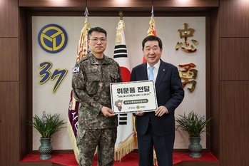 충북 증평군이 설 명절을 앞두고 지역 내 군부대를 잇따라 방문하며 장병들을 격려하고 군·지자체 간 안보 협력 강화에 나섰다고 6일 밝혔다. 이재영 증평군수는 지난 5일 육군 제37사단을 찾아 위문품으로 지역화폐인 '증평사랑으뜸상품권'을 전달했다. 이번 방문은 명절 연휴