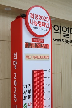 충북사회복지공동모금회(회장 이민성, 이하 충북모금회)는 ‘희망2025나눔캠페인’ 성금모금이 23일 현재 모금목표인 104억 원을 돌파해 107억5900만원으로 사랑의온도 103.5도를 달성했다고 밝혔다.‘기부로 나를 가치있게, 기부로 충북을 가치있게’라는 슬로건으로 진