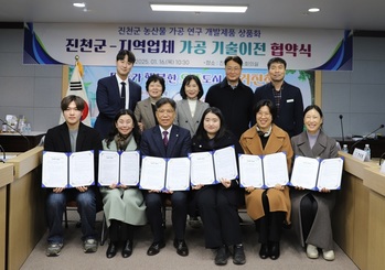 충북 진천군은 16일 군청 소회의실에서‘진천군-지역업체 가공 기술이전 협약식’을 열었다고 밝혔다.이번 협약은 진천군 특산물을 활용한 가공상품을 다양한 관광상품으로 소득화하고자 마련됐으며 이 자리에는 관내 5개 업체, 관계자 등 10여 명이 참석했다. 진천군에서 개발해
