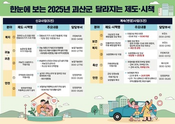 충북 괴산군이 3일 을사년 새해 군민들에게 직접 영향을 미치는 2025년 달라지는 제도 및 시책을 발표했다.주요 제도는 △복지 △보건 △경제 △문화·예술·체육 △교육 △농정·축산 △일반행정 △환경 △식의약 △소방·안전 등 10대 분야 82건(괴산군 10건, 충북 72건