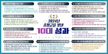 충북 증평군이 2024년 한 해를 마무리하며 올해 군정을 빛낸 10대 주요 성과를 20일 발표했다. 군이 발표한 10대 성과는 △증평형 아이돌봄 추진을 통한 저출산 위기극복 및 돌봄서비스 확대 △증평형 노인통합돌봄 및 생활밀착형 복지정책 확대 △지속가능한 농업