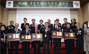 충북도는 제24회 충북도 도민대상 시상식이 12일 도청에서 김영환 지사와 수상자 5명, 가족․친지 및 도민대상 심사위원과 역대 수상자 등 80여 명이 참석한 가운데 개최됐다고 밝혔다. 시상식은 도민대상 심사 경과보고를 시작으로 부문별 시상, 도지사 인사말, 수