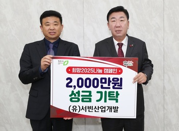 (유)서빈산업개발은 5일 소외된 불우 이웃을 돕고자 ‘희망2025 나눔캠페인’에 동참하면서 청주시에 성금 2천만원을 기탁했다.이날 오전 임시청사서 개최된 기탁식에는 이범석 청주시장과 (유)서빈산업개발 최명훈 대표, 박호종 ㈜장성도시개발 대표가 참석했다.최명훈 대표는 “