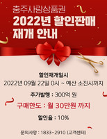 충북 충주시는 지난달 조기 소진에 따라 일시 중단했던 충주사랑상품권 할인판매를 오는 22일부터 판매를 재개한다고 20일 밝혔다. 충주시에 따르면 지역경제 활성화를 위해 추진한 충주사랑상품권이 10% 할인판매로 인기를 끌면서 연초 발행한 1200억원