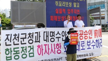 진천군의회(의장 이재명)는 8일 진천군청 앞에서 진천풍림아이원트리니움 입주자 비상대책위원회가 주최한 입주 촉구 집회 현장에서 시행사의 무책임한 태도를 강력 규탄했다.이날 연단에 오른 이재명 의장은 “총 2450세대의 입주예정자들이 갑작스럽게 전월세를 전전하게 되고, 중